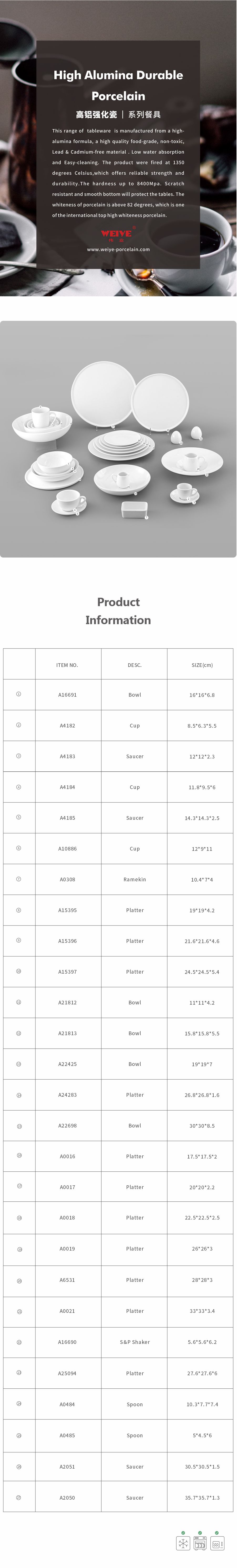This range of tableware is manufactured from a high-alumina formula, a high quality food-grade, non-toxic, Lead & Cadmium-free material . Low water absorption and Easy-cleaning. The product were fired at 1350 degrees Celsius,which offers reliable strength and durability.The hardness up to 8400Mpa. Scratch resistant and smooth bottom will protect the tables. The whiteness of porcelain is above 82 degrees, which is one of the international top high whiteness porcelain.
