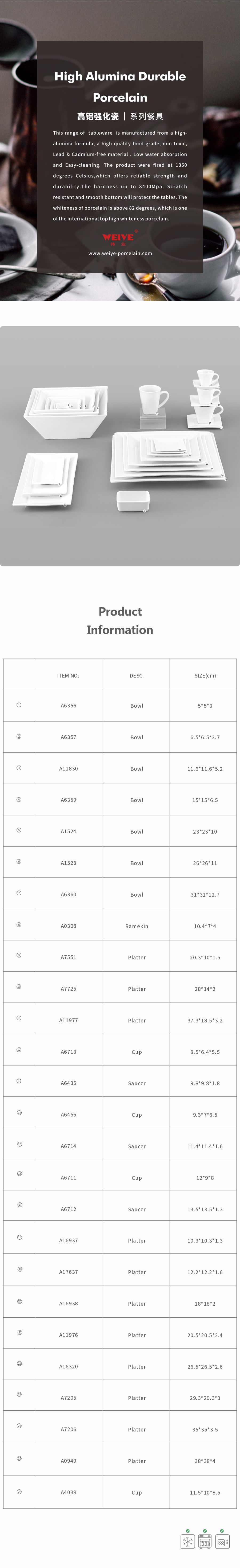 This range of tableware is manufactured from a high-alumina formula, a high quality food-grade, non-toxic, Lead & Cadmium-free material . Low water absorption and Easy-cleaning. The product were fired at 1350 degrees Celsius,which offers reliable strength and durability.The hardness up to 8400Mpa. Scratch resistant and smooth bottom will protect the tables. The whiteness of porcelain is above 82 degrees, which is one of the international top high whiteness porcelain.