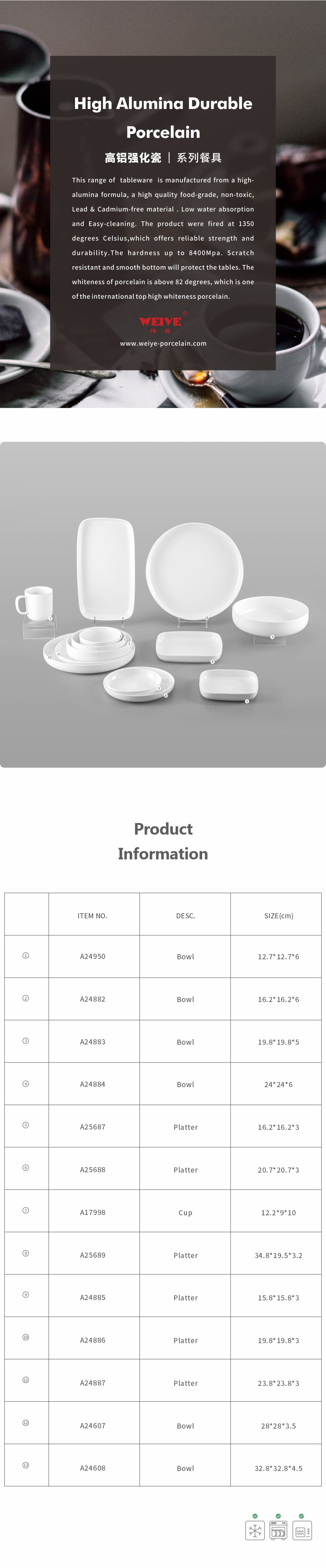 This range of tableware is manufactured from a high-alumina formula, a high quality food-grade, non-toxic, Lead & Cadmium-free material . Low water absorption and Easy-cleaning. The product were fired at 1350 degrees Celsius,which offers reliable strength and durability.The hardness up to 8400Mpa. Scratch resistant and smooth bottom will protect the tables. The whiteness of porcelain is above 82 degrees, which is one of the international top high whiteness porcelain.