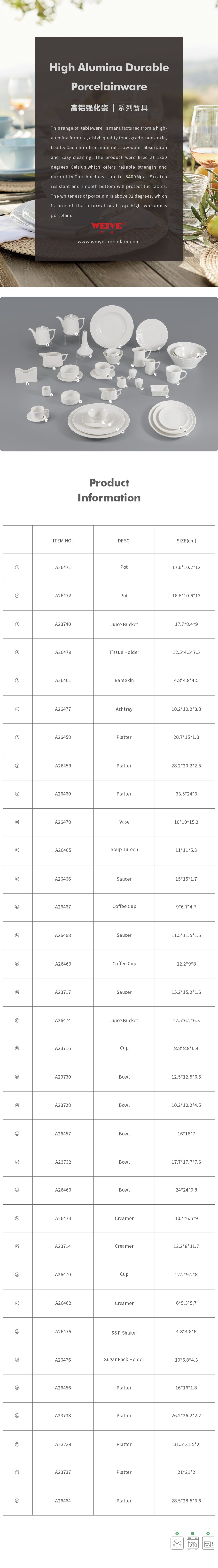 This range of tableware is manufactured from a high-alumina formula, a high quality food-grade, non-toxic, Lead & Cadmium-free material . Low water absorption and Easy-cleaning. The product were fired at 1350 degrees Celsius,which offers reliable strength and durability.The hardness up to 8400Mpa. Scratch resistant and smooth bottom will protect the tables. The whiteness of porcelain is above 82 degrees, which is one of the international top high whiteness porcelain.